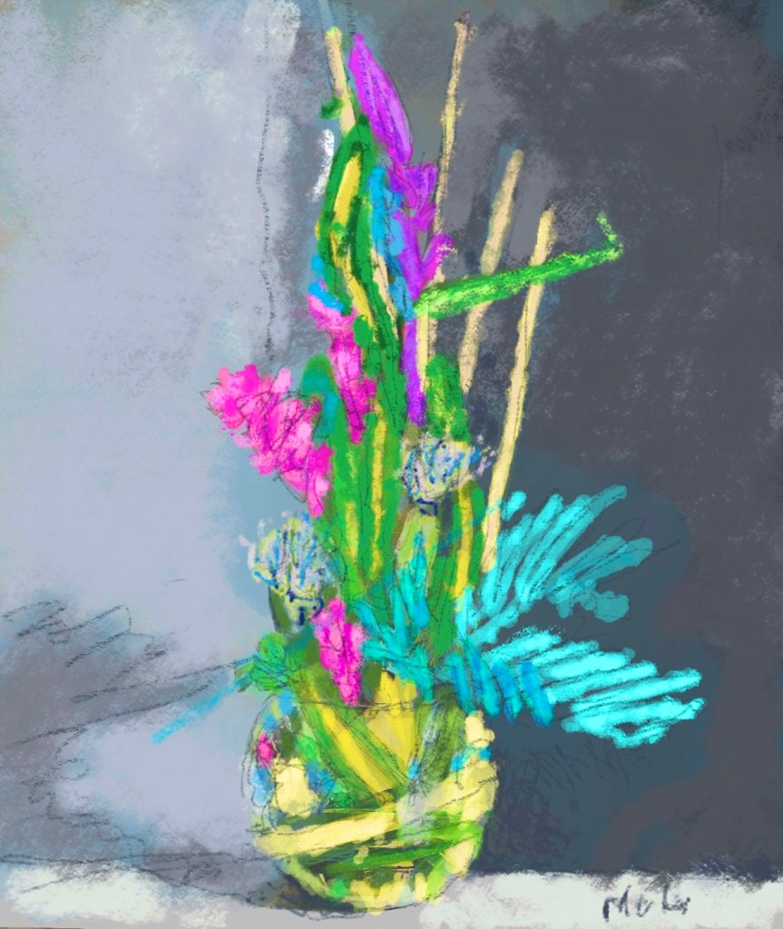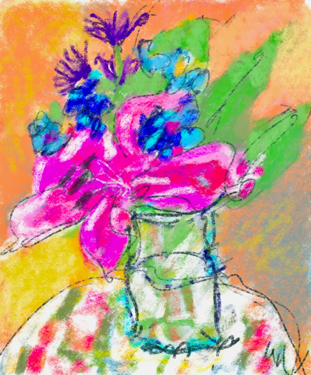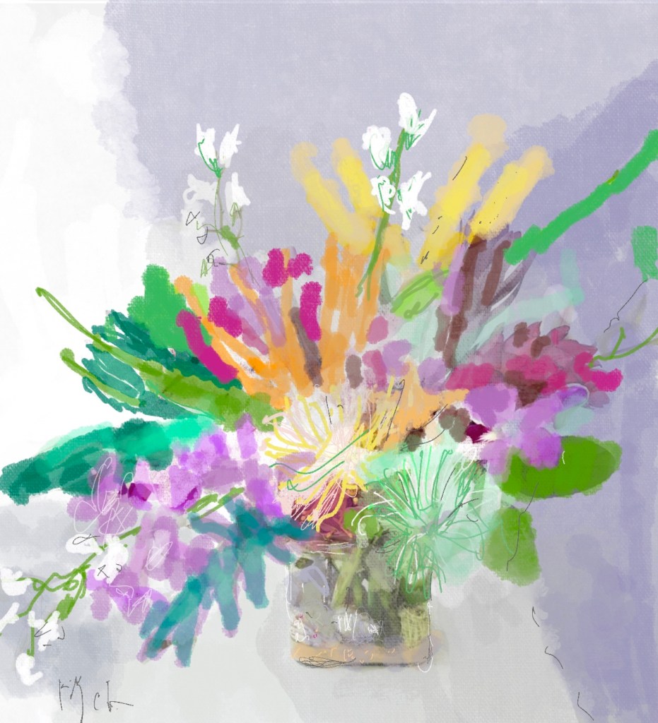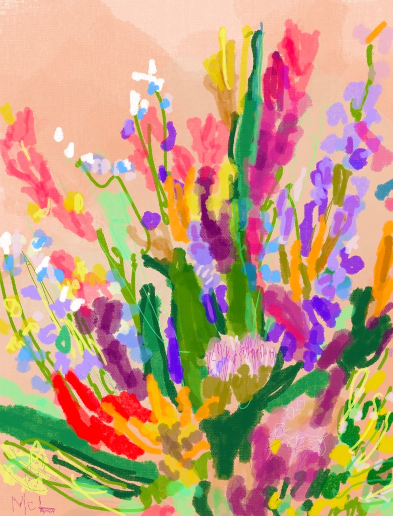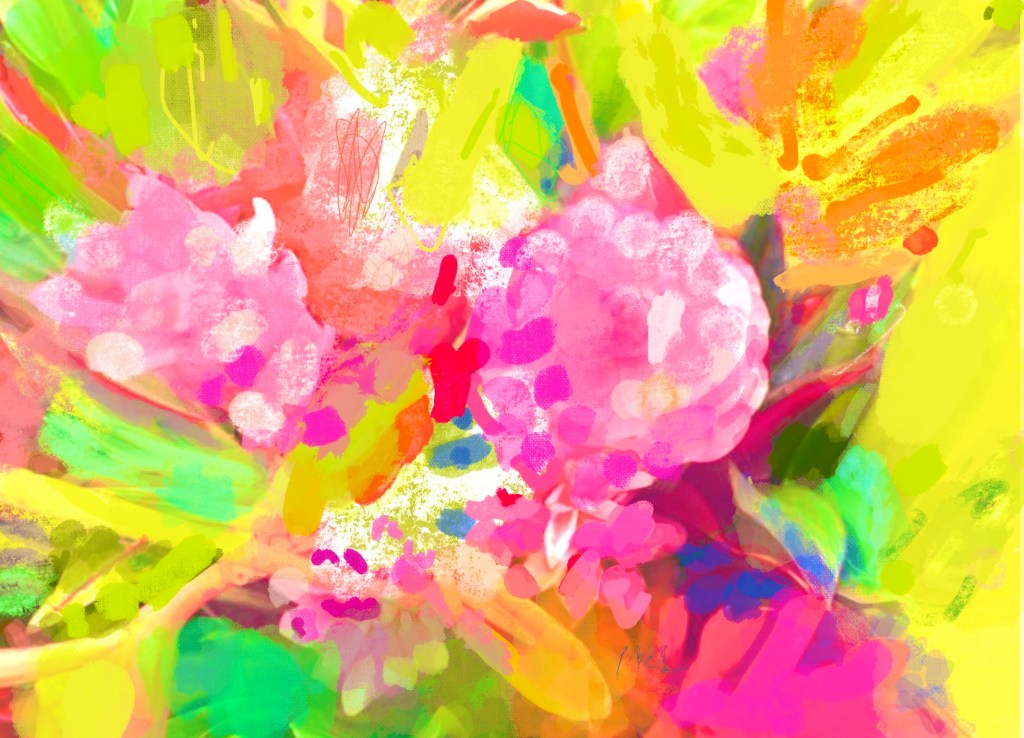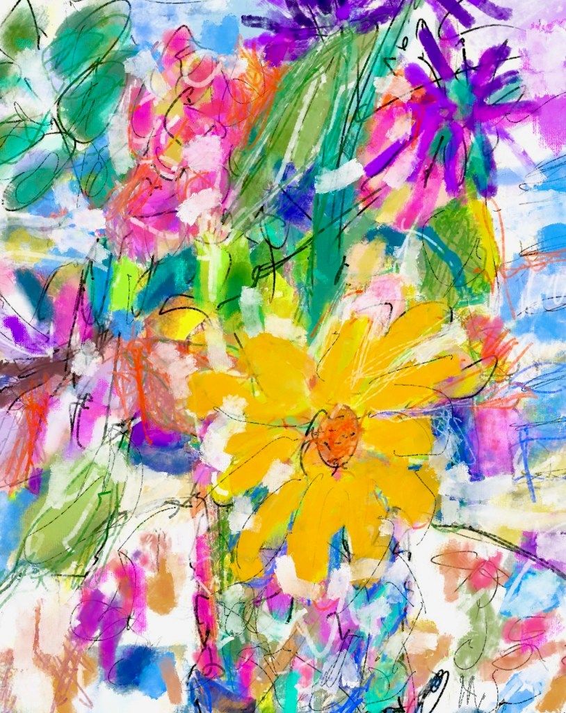 A vibrant abstract floral artwork featuring a prominent yellow flower surrounded by colorful blooms and lively brushstrokes.