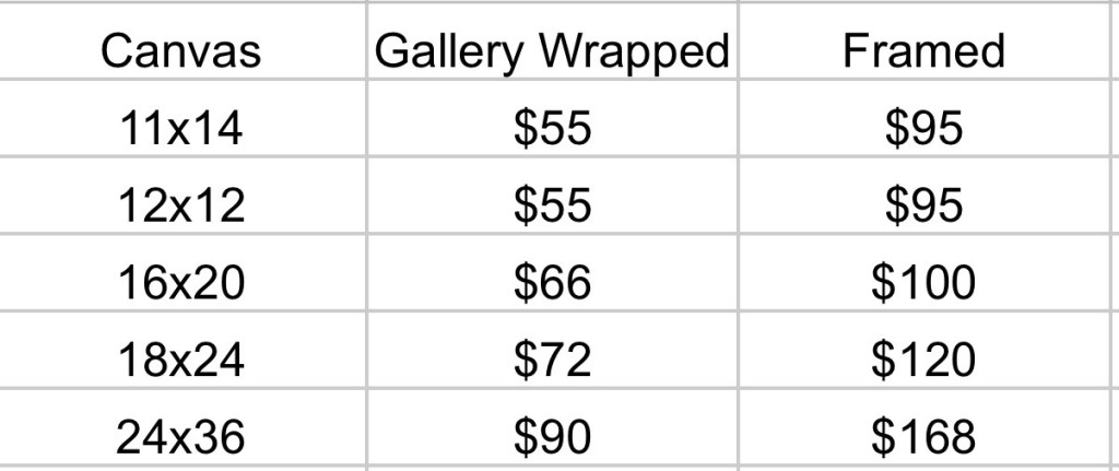 Contact me via email to order prints. Options include size, framed or unframed (gallery wrapped) prints on paper, canvas or metal. I’ll provide a quote that includes shipping direct to your address. Payment options include PayPal, Venmo, Square, Apple Pay.